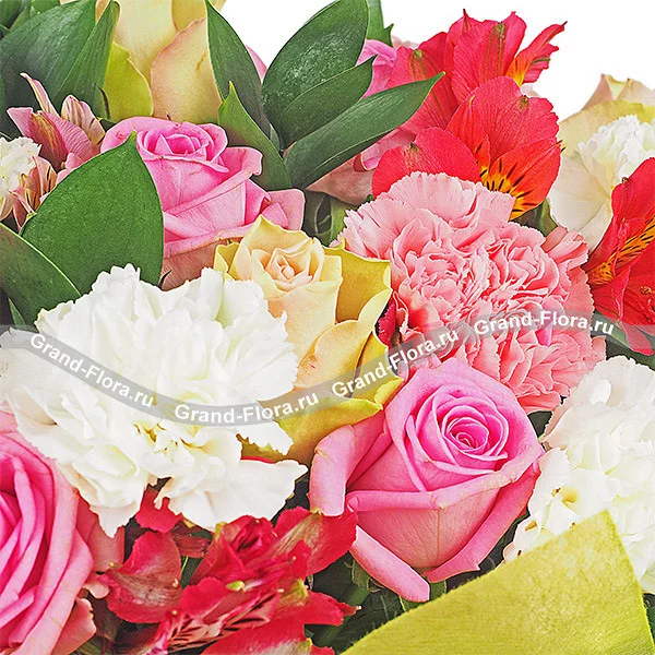 Стандартный (на фото): роза розовая - 5 шт., роза желтая - 4 шт., гвоздика розовая - 5 шт., гвоздика белая - 5 шт., альстромерия розовая - 1 шт., альстромерия красная - 2 шт.,